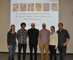 Motivated by Prof. Aldo R. Boccaccini (Head, Institute of Biomaterials), the Erlangen branch of the Young Members Section of the German Materials Society (DGM) (“Jung-DGM Erlangen-Nuremberg”) was founded in November 2016. The current speaker of the Jung-DGM Erlangen-Nuremberg is Ms Svenja Heise (Institute of Biomaterials). In addition to organizing frequently “Stammtisch”-Meetings for its members, last Tuesday 24th January the Jung-DGM Erlangen-Nuremberg presented the 10th lecture of the Materials Science Colloquium (WW-Kolloquium) in the Department of Materials Science and Engineering at FAU. Dr. Achim Kuhn, former FAU student of materials science, now at Wieland Werke AG, was invited and he gave a talk about recent developments on copper-based functional materials and provided insights into industrial research. After the presentations the audience had the possibility to ask questions and discuss with the presenter while enjoying “Beer and Pretzls”, sponsored by the DGM. The colloquium was actively attended and was met with great approval by undergraduate students, PhD students and research staff of the Department. it is planned that the Jung-DGM Erlangen-Nuremberg will continue organizing invited presentations as part of the Materials Science Colloquium each academic term. In the pictures the current leaders of Jung DGM Erlangen-Nuremberg with Dr. Kuhn and the audience. Students and young researchers at FAU willing to join the Jung-DGM Erlangen-Nuremberg should contact: erlangen-nuernberg@jungedgm.de or the Facebook page