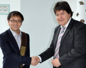 On 22nd March 2017 Kai Zheng successfully defended his doctoral thesis in the field of bioactive glass nanoparticles for biomedical applications, which was carried out under the supervision of Professor Aldo R. Boccaccini at our Institute. In addition to Prof. Boccaccini, Prof. Antonio Salinas, Department of Inorganic and Bioinorganic Chemistry, Complutense University of Madrid, Spain, Prof. Robin Klupp-Taylor (Department of Chemical and Biological Engineering, FAU), and Prof. Stephan Wolf (Institute for Glass and Ceramics, FAU), were the members of the doctoral defense committee. Prof. Boccaccini praised Kai’s pioneering research focusing on the synthesis of bioactive glass nanoparticles (BGNP) with added functionalities by adapting the Stoever sol-gel method, which has led to several new ion doped BGNP of interest for a variety of biomedical applications, from bone tissue engineering to imaging and drug delivery. The attachment of biomolecules on the BGNP surfaces was also explored. Kai was recipient of a scholarship of the China Scholarship Council (CSC) and during the period of his doctoral studies he collaborated with research groups in other FAU Departments, TU Munich and AGH Krakow, Poland. Several publications have resulted from Kai’s results (see for example refs. [1-3]). We congratulate Kai on achieving his doctoral degree with great success and wish him all the best in his post-doctoral career.