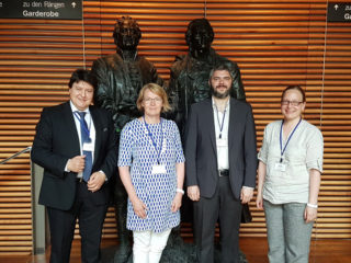 Our Institute was represented at the 91st Annual Meeting of the German Glass Society (DGG), held in Weimar, Germany, on 29-31 May 2017. Professor Boccaccini co-organized the special session “Glasses in Healthcare” in collaboration with Prof. Delia Brauer, University of Jena, Germany. Keynote speakers in the session were Prof. Leena Hupa, Åbo Akademi Johan Gadolin Process Chemistry Centre, Finland, and Prof. Jonathan Massera, Tampere University of Technology, Finland (pictured with Prof. Boccaccini). Profs. Brauer, Hupa, Massera and Boccaccini are members of the Technical Committee 04 (TC04, “Bioglasses”) of the International Commission on Glass. In the session “Glasses in Healthcare”, Dr. Kai Zheng presented the oral contribution “Strategies for the Synthesis of Highly Dispersed Cu- and Zn-containing Bioactive Glass Nanoparticles” and Dr. Preethi Balasubramanian presented the oral contribution: “Surface Functionalization of Borosilicate Bioactive Glass Scaffolds”. In addition, the poster entitled: “Development and Characterization of Ordered Mesoporous Bioactive Glasses with Antibacterial Properties (authors: F. Ciraldo and A. R. Boccaccini) was presented. Prof. Boccaccini announced also the recent success of the EU (Horizon 2020) project: “Centre for functional and surface-functionalized glasses (FunGlass)” aiming at establishing a new Centre of Excellence in Trencin, Slovakia on Advanced Glass Materials.