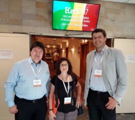 Prof. Aldo R. Boccaccini was an invited speaker at the 15th Conference and Exhibition of the European Ceramic Society (ECerS), held on July 9-13, 2017, in Budapest, Hungary. Prof. Boccaccini presented the talk: “Expanding applications of bioactive glasses in tissue engineering and wound healing” in the symposium “Ceramics and glasses for healthcare”. Our institute was also represented by Ms Nicoletta Toniolo, who presented the poster: “Geopolymers incorporating silicate waste” and Ms Rocio Tejido-Rastrilla, who presented the poster: “Surface functionalization of novel silicate bioactive glass by bioinspired coating”, both PhD students (pictured with Prof. Boccaccini) in the ITN EU project “Advanced glasses, Composites And Ceramics for High growth Industries European Training Network (ETN) – CoACH“. Prof. Boccaccini met numerous colleagues, including: Prof. Alicia Duran (Institute of Ceramics and Glasses, Madrid) and Dusan Galusek (Alexander Dubček University, Trenčín, Slovakia), collaborators in the project “Centre for functional and surface-functionalized glasses” (FunGlass). Prof. Boccaccini also pictured with Prof. Csaba Balázsi, Conference Chair, Centre for Energy Research, Hungarian Academy of Sciences, Hungary, Prof. Begona Ferrari (Institute of Ceramics and Glass, Madrid), Prof. Paolo Colombo (University of Padova, Italy), Prof. Jerome Chevalier (INSA Lyon, France), Prof. Rodrigo Moreno (Institute of Ceramics and Glass, Madrid).