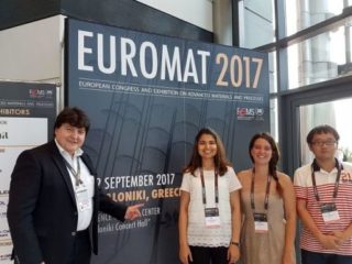 Our Institute had a visible participation at the European Congress and Exhibition on Advanced Materials and Processes, EUROMAT 2017, held in Thessaloniki, Greece, on 17-22 September 2017. Prof. Boccaccini co-organised two symposia in Topic Area F “Biomaterials and Healthcare”, namely symposium F1 “Biomaterials for Tissue Engineering” and F4 “The Next Generation of Implants with Multi-Functional Properties”. The oral presentations from our Institute were given by Dr. Kai Zheng [1,2], Ms Francesca Ciraldo [3] and Ms Seray Kaya [4] (pictured with Prof. Boccaccini). In addition, the following poster and oral presentations involved co-authorship from members of our Institute [5-9]. Prof. Boccaccini is pictured with colleagues, including Prof. Enrique Sanchez, Univ. of Castellon, Spain, Prof. Antonio Salinas, UCM, Madrid, Spain, co-organiser of symposium F1, Dr. Sophia Tsipas, Univ. Carlos III, Madrid, Spain, Prof. Andres Lasagni, TU Dresden, Germany, Prof. E. Aifantis, Univ. of Thessaloniki, Greece, Dr. Katalin Balázsi and Prof. Csaba Balazsi, Hungarian Academy of Sciences, Hungary.