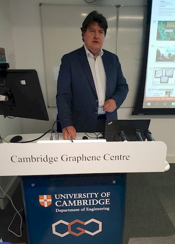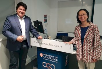 On 26th July, Prof. Aldo R. Boccaccini presented an invited lecture in the framework of the Graphene CDT Advanced Technology Lectures series at the Cambridge Graphene Centre, the Research Centre on Graphene, Layered Crystals and Hybrid Nanomaterials directed by Prof. Andrea C. Ferrari at University of Cambridge, UK. He presented the lecture “Electrophoretic deposition: versatile processing technique for graphene and related carbon nanomaterials”. Prof. Boccaccini discussed areas for future collaborations with members of the Centre. He also met Dr. Yan Yan Shery Huang, lecturer in the Engineering Department, University of Cambridge. Dr. Shery Huang (pictured with Prof. Boccaccini) was student at Imperial College London (Department of Materials) at the time Prof. Boccaccini was an academic staff member at Imperial.