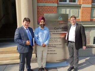 On 27th August 2019, Prof. Aldo R. Boccaccini was at Ilmenau University of Technology (TU Ilmenau), Ilmenau, Germany, Faculty of Mathematics and Natural Sciences, where he attended the scientific presentation of Dr. Sukhdeep Singh entitled “Chemical toolbox for designing small bioactive molecules and fragments in search of tunable bioactive surfaces”, which was given in the framework of his “Habilitation” procedure. In the picture, Prof. Boccaccini, Dr. Sukhdeep Singh and Prof. Andreas Schober, Department of Nano-biosystem Technology TU Ilmenau. We plan future collaboration with Dr. Singh and Prof. Schober in the field of biochemical functionalization of engineered biomaterials. Prof. Boccaccini was a research lecturer at TU Ilmenau, Faculty of Mechanical Engineering, in the period 1997-2000 and received his “Habilitation” in Materials Technology at TU Ilmenau (mentor: Prof. Heinrich Kern) in 2001.