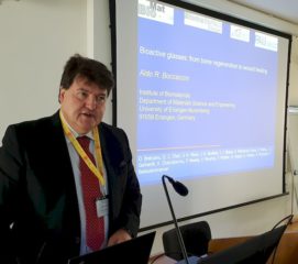 Prof. Aldo R. Boccaccini was an invited speaker at the Annual Conference of the Society of Glass Technology (SGT) “Sand to Splendour” held in Cambridge, UK, on 2-5 September 2019. He presented the lecture “Bioactive glasses: from bone regeneration to wound healing” at the Science Session of the Conference. At the same conference, Prof. Boccaccini was awarded the Fellowship of SGT. He has been a member of the Basic Science and Technology Committee (BSTC) of SGT for more than 15 years. In the photos: Prof. Boccaccini receiving the Fellowship certificate from Mr. Stuart Hakes, SGT president, and with Prof. Delia Brauer (University of Jena, Germany) and Prof. Paul Bingham (Sheffield Hallam University, and secretary of the BSTC of SGT).