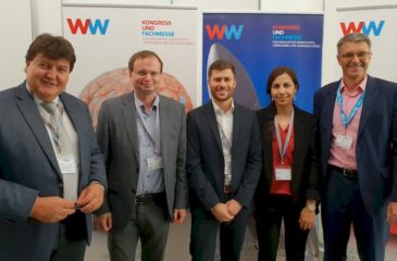 On 18-20 September 2019 Prof. Aldo R. Boccaccini and Mr Jonas Hazur (PhD student) attended the Werkstoffwoche 2019 conference in Dresden, Germany, a conference organised by the German Materials Society (DGM). Prof. Boccaccini was the co-organiser of two symposia, namely “Biomaterials” and “Biofabrication”. He presented the oral contribution: Bioactive glass-based scaffolds incorporating phytotherapeutics and biologically active ions for tissue engineering applications. In the sesion “Biofabrication”, Mr Hazur presented the lecture Rheological characterisation and 3D printing of cross-linked alginate bioinks. The “Biofabrication” symposium was co-organised by Prof. T. Scheibel (Univ. of Bayreuth), Prof. J. Groll (Univ. of Würzburg) and Prof. A. R. Boccaccini under sponsorship of the Collaborative Research Centre SFB/TRR 225 “From the fundamentals of biofabrication towards functional tissue models” . TRR 225 members Prof. L. Ionov, Dr. S. Salehi, Prof. T. Scheibel (Univ. of Bayreuth), Mr J. Hazur and Prof. Boccaccini (pictured).