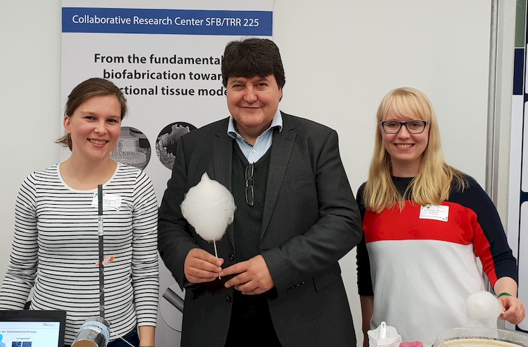 Our Institute was present with a stand and several demonstrators at the “Long Night of the Sciences” in Erlangen. The stand was placed in the exhibition area of the Department of Materials Science and Engineering and different experiments were demonstrated, including electrospinning of polymer fibres, 3D printing for biomedical products and hydrogel capsule formation for drug delivery. Prof. Boccaccini said: “this has been the most successful participation of our Institute in this important public relations activity of our University. We received an impressive number of visitors in our stand who showed their interests in biomedical materials and their applications. I express my gratitude to all members of the Institute who were involved and made our participation a success”.