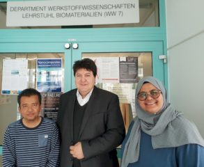 On occasion of the International Symposium to celebrate the 10 years of our Institute, held on 29.11.2019, we received numerous alumni and collaborators from all over the world. We were happy to welcome back in our Institute Dr. Maizlinda Izwana Idris, Associate Professor, and Dr. Hasan Zuhudi Abdullah, Associate Professor, both at the Bioactive Material Focus Group, Faculty of Mechanical and Manufacturing Engineering, Universiti Tun Hussein Onn Malaysia, Batu Pahat, Malaysia. Profs. Idris and Abdullah were visiting researchers in our Institute in 2017-2018 and we collaborated on different research topics involving SPION-biopolymer composite microspheres (Maizlinda) and electrophoretic deposition of bioactive coatings (Hasan). Currently Prof. Boccaccini is an external collaborator in two projects led by Profs. Idris and Abdullah based at Universiti Tun Hussein Onn Malaysia.