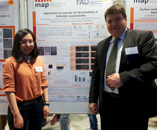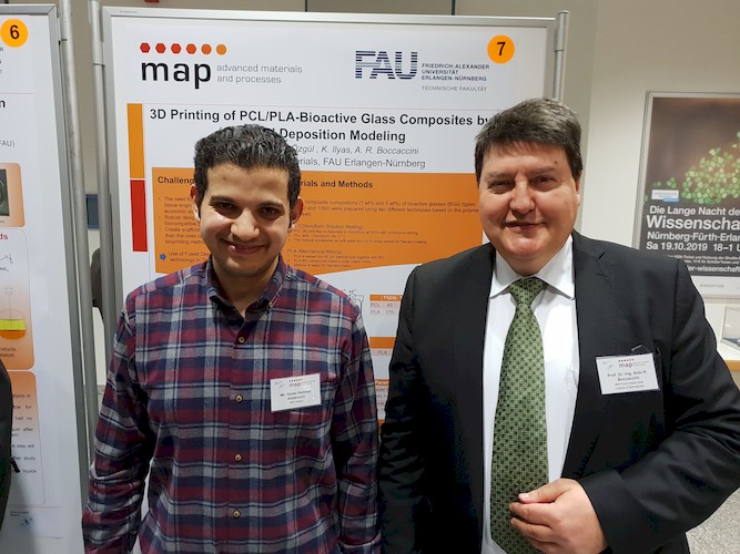 Prof. Aldo R. Boccaccini, Dr. Julia Will and Dr. Liliana Liverani attended the Poster presentations evening of Master students of the Elite Master’s Programme “Advanced Materials and Processes“ (MAP), which took place on 5th February at Fraunhofer-Institut IISB, Erlangen. It was attended by numerous lecturers of the program from the FAU Departments of Materials Science and Engineering (WW) and Chemical and Biological Engineering (CBI). Hsuan-Heng Lu, Abdel Rahman Altakroury, Yu Zhong, Elpida Zormpa, Benedikt Hanschmann,and Sharmin Khan Antara, Master students who carried out their research projects under supervision of Prof. Boccaccini (pictured), presented posters in several research areas including: bioinks for 3D printing, fused deposition modeling of composite scaffolds, biomaterials for cancer research, and mesoporous bioactive glass nanoparticles. Prof. Boccaccini is the Focal Subject Chair for the Focal Subject “Biomaterials and Bioprocessing” in the Elite Master’s Programme.