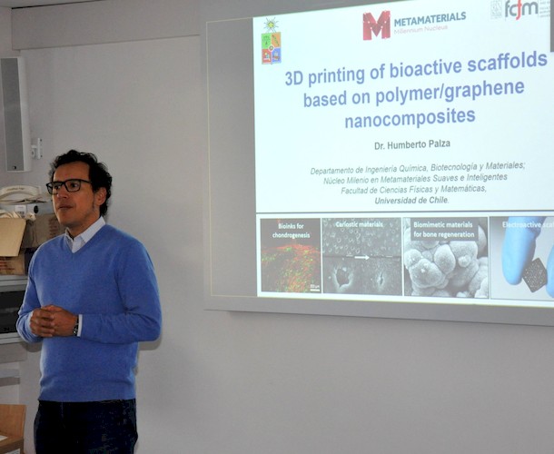 On 11th Feb. 2020 we received the visit of Prof. Humberto Palza,, Department of Chemical Engineering, Biotechnology and Materials, Faculty of Physical and Mathematical Sciences, University of Chile, Santiago, Chile. Prof. Palza presented the invited seminar “3D printing of bioactive scaffolds based on polymer/graphene nanocomposites” in the framework of the International Seminar Series 2020 of the Collaborative Research Centre TRR 225/SFB “From the fundamentals of biofabrication towards functional tissue models”. He also visited our laboratories and discussed future collaborations in the field of 3D printing bioactive composites. We have carried out collaboration previously with the group of Prof. Palza in the field of bioactive glass-polymer composites, and results were published for example in J. Biomed. Mater. Res. A [1].