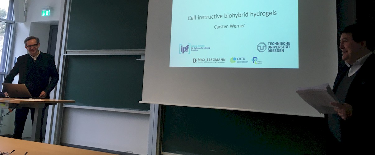 On 4th March 2020 we received the visit of Prof. Carsten Werner , Leibniz Institute for Polymer Research, and Head of the Institute Biofunctional Polymer Materials within the Max Bergmann Center of Biomaterials, Dresden, hosted by Prof. Aldo R. Boccaccini. Prof. Werner presented the invited talk “Cell Instructive Biohybrid Hydrogels” in the framework of the seminar series of the project “Novel Biopolymer Hydrogels for Understanding Complex Tissue Biomechanics”, which is funded by the Emerging Fields Initiative (EFI) of the University of Erlangen-Nuremberg (FAU) and involves researchers from the Faculties of Engineering, Natural Sciences and Medicine of FAU. The visit offered the opportunity to discuss with Prof. Werner on the development and characterisation of hydrogels with specific properties of relevance for the mentioned EFI project, which focuses on the categorization of biological tissues according to their mechanical behavior and investigates the biofabrication of hydrogel based biomaterials with similar properties to living tissues. The principal investigators are: Dr. Silvia Budday and Prof. Paul Steinmann (coordinator, Mechanical Engineering), Prof. Ben Fabry (Biophysics), Prof. Friedrich Paulsen (Anatomy) and Prof. Aldo R. Boccaccini (Biomaterials).