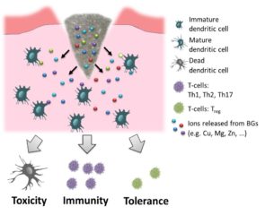 Our new paper “Cu, Zn doped borate bioactive glasses: Antibacterial efficacy and dose-dependent in vitromodulation of murine dendritic cells”, . This is the result of a research collaboration with Dr. Elisabeth Zinser, Department of Immune Modulation, University Hospital Erlangen (Head: Prof. A. Steinkasserer) in the framework of the doctoral thesis of Ms Katharina Schuhladen, collaborating also with Dr. Jochen Schmidt (Institute of Particle Technology, FAU). The paper focuses on the influence that bioactive glasses (BGs) could have on the immune system. In particular, we investigated the interaction between undoped and Cu and/or Zn-containing borate BGs with dendritic cells, which are known to be the most potent antigen-presenting cells of the immune system. Our results indicate that there is a dose-depending and composition depending effect of the ionic dissolution products of BGs on the modulation and regulation of immune responses of dendritic cells. The study also includes results on the antibacterial properties of the investigated glasses.