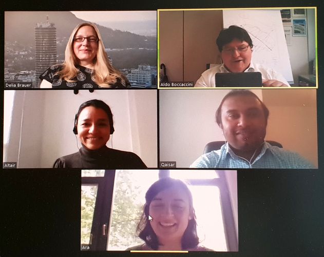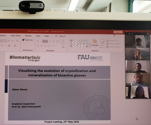 On 25th May 2020 Prof. Aldo R. Boccaccini and Qaisar Nawaz (PhD student) attended the remote progress meeting of the DFG funded project on advanced microstructural characterisation of bioactive glasses and glass-ceramics. In this project, researchers from Fraunhofer Institute for Microstructure of Materials and Systems (IMWS), group Nanomaterials and Nanoanalytics (GNN), Halle, the Institute of Biomaterials at FAU and the group of Prof. Delia Brauer, at Otto Schott Institute of Materials Research, University of of Jena, collaborate in the field of advanced and in-situ characterisation of a series of bioactive glasses (BGs) and glass-ceramics. Different compositions of BGs are investigated, which are developed by melting and by sol-gel techniques. Our latest article from this project has been published (Open Access) recently in the J. of the American Ceramic Society [1]. In the photo Ms Altair Contreras (University of Jena), Dr. Araceli de Pablos-Martín (IMWS), Mr Qaisar Nawaz (Biomaterials Erlangen) Prof. Delia Brauer (Univ. of Jena) and Prof. Aldo R. Boccaccini.