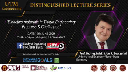 On 19th June, Prof. Boccaccini presented the lecture “Bioactive materials in tissue engineering: progress and challenges” in the framework of the “Distinguished Lecture Series” of the Faculty of Engineering, Universiti Teknologi Malaysia. The lecture, delivered remotely, addressed one of the United Nations Sustainable Development Goals (SDG), and it was advertised widely by the organisers.