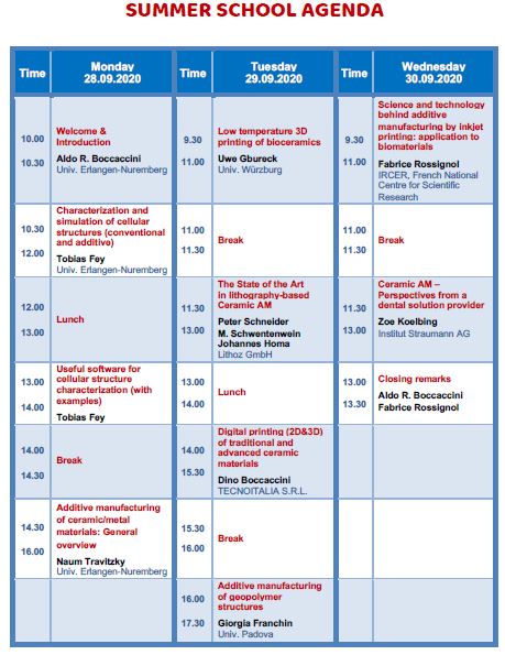 The Summer School on “Additive Manufacturing of Ceramics”, organized by Prof. Aldo R. Boccaccini in the framework of the EU RISE project AMITIE (“Additive Manufacturing Initiative for Transnational Innovation in Europe”), will be held on 28-30th September on a ZOOM platform. The schedule includes experienced speakers from both industry and academia covering a broad range of topics and technologies in the field of AM of ceramics. The participation is free of charge, however interested participants should contact Ms Stéphanie de NEXON (H2020 Project Manager) at stephanie.de-nexon@unilim.fr and register.