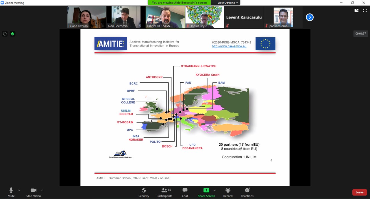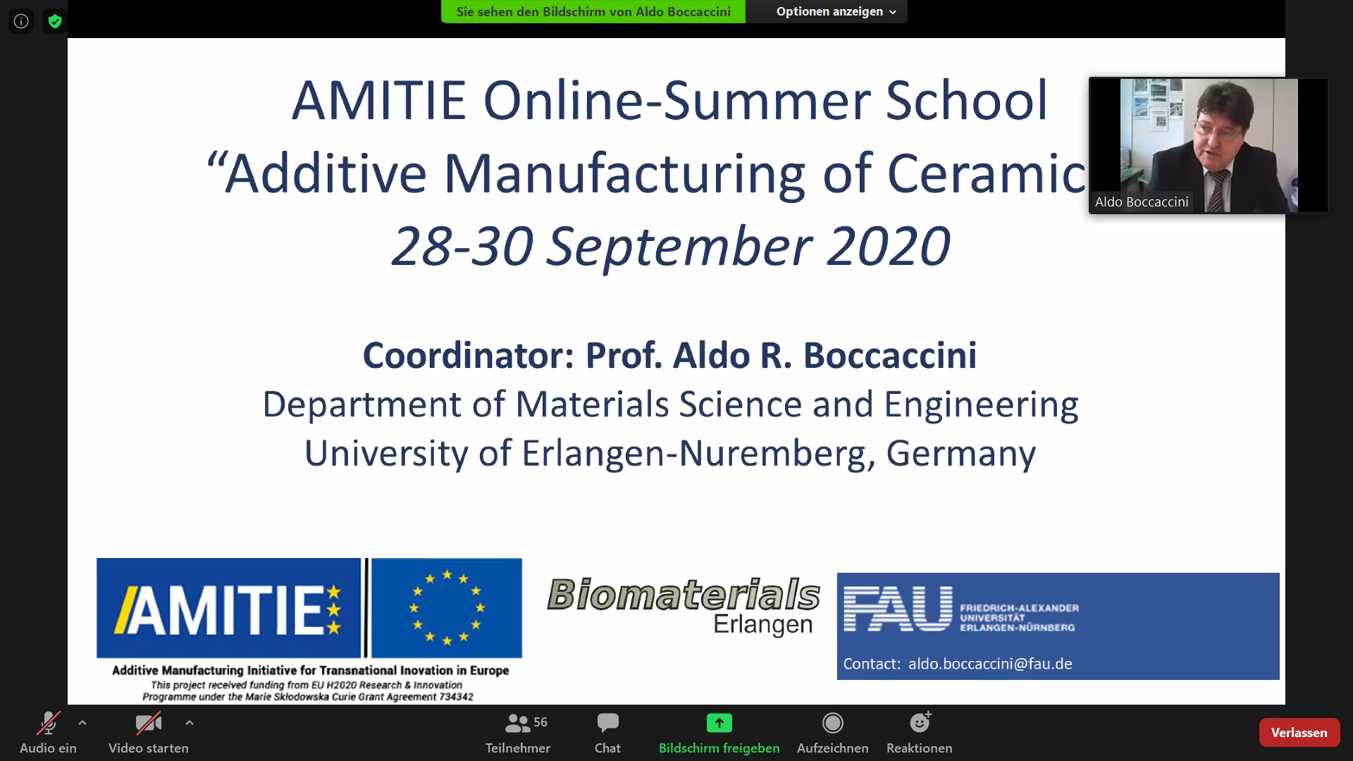 The Summer School on “Additive Manufacturing of Ceramics”, organized by Prof. Aldo R. Boccaccini in the framework of the EU RISE project AMITIE (“Additive Manufacturing Initiative for Transnational Innovation in Europe”), was successfully held in digital form on 28-30th September. The schedule included speakers from Italy, France, Germany, Austria and Switzerland, both from industry and academia, covering a broad range of topics and technologies in the field of Additive Manufacturing of ceramics. More than 100 participants attended the Summer School.