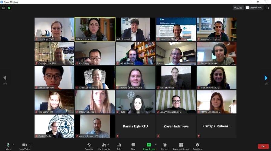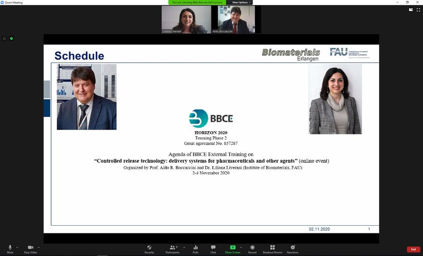 Prof. Aldo R. Boccaccini and Dr. Liverani were the organizers of the external training session on “Controlled release technology: delivery systems for pharmaceuticals and other agents”, which was held remotely on 2-4 November 2020 in the framework of the program of training activities of the Baltic Biomaterials Centre of Excellence (BBCE) . Researchers from all partner institutions in Latvia attended the sessions, in addition to participants from the international partners AO Research Institute Davos (Switzerland) and FAU Institute of Biomaterials (Biomat-FAU). BBCE project´s main objective is to establish a joint Baltic Biomaterials Centre of Excellence for advanced biomaterials development based on the long-term strategic cooperation between ARI, Biomat-FAU and Lavian institutions (RTU RBIDC, LIOS, RSU and RSU IS). It has received funding from the European Union’s Horizon 2020 research and innovation programme under grant agreement No 857287. We thank all speakers for their inspiring talks and support of this training activity.