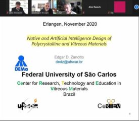 On 17th Nov. 2020, Prof. Edgar Zanotto, Prof. of Glass Science and Technology, Head of the Vitreous Materials Laboratory, Univ. of Sao Carlos, Brazil, was the invited speaker at the Materials Science Colloquium of the FAU Department of Materials Science and Engineering. The colloquium was hosted by Prof. Dominique De Ligny (Institute of Glass and Ceramics) and Prof. Aldo R. Boccaccini. Prof. Zanotto presented a lecture entitled: “Native and Artificial Intelligence Design of Polycrystalline and Vitreous Materials”. More than 120 members of the Department attended the lecture.