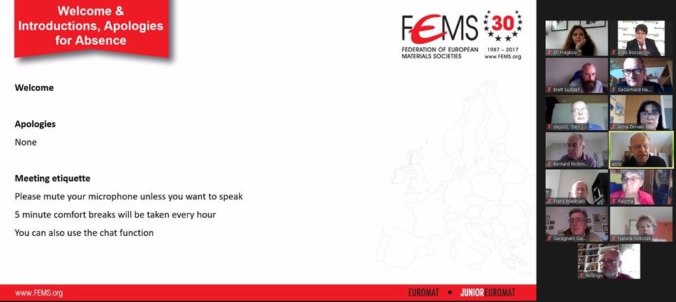 Prof. Aldo R. Boccaccini attended the (remote) meeting of the Executive Committee (EC) of the Federation of European Materials Societies (FEMS) , chaired by FEMS president Prof. Eric Le Bourhis, which took place on 24th November 2020. FEMS is a not-for profit association of European materials societies and associations covering several fields of materials science and engineering, including metals, polymers, ceramics, composites, glasses, nano and biomaterials in 22 different countries. Prof. Boccaccini represents the German Materials Society (DGM) in the FEMS EC since 2017. An important recent announcement made by FEMS has been the launch of the new journal: _European Journal of Materials (EJM). Prof. Boccaccini was appointed Editor for the Section: “Biomaterials for life science and healthcare” in EJM.
