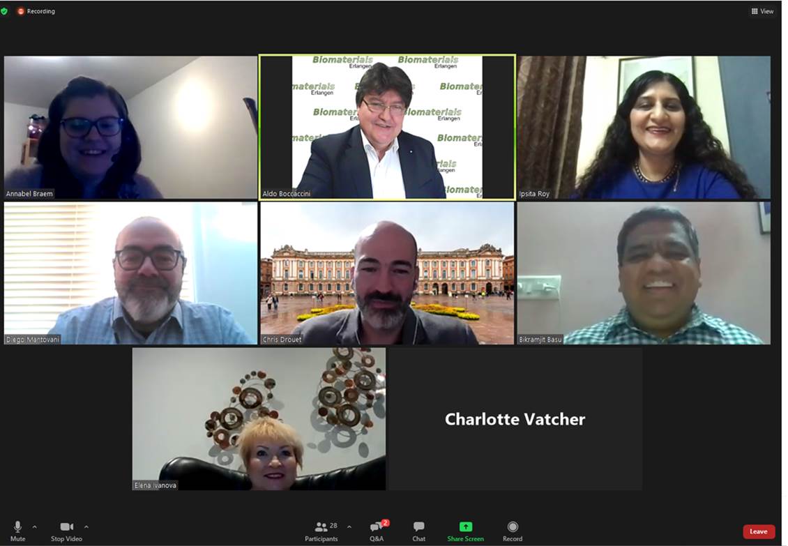 Our Institute was well represented at the 11th WORLD BIOMATERIALS CONGRESS (WBC 2020) held remotely on 11-15 December 2020. Prof. Boccaccini was an invited speaker in two workshops. He presented the lecture “Enhancing antibacterial effects of bioactive glasses by phytotherapeutic agents” in the “Challenges in Antimicrobial Biomaterials Development”educational pre-congress workshop. Moreover he presented the talk “Bioactive glasses with tuned ion releasing capability to stimulate stem cells for tissue engineering” in the workshop “Controlling stem cell pathways through materials”. Vera Bednarzig (PhD student) presented the poster “Bioactive glass-alginate composites as 3D printing material for bone regneration” in the session ” Additive Manufacturing/ 3D Printing”. Dr Kai Zheng presented the poster: “Boron incorporation regulates dissolution behavior of sol-gel derived silicate bioactive glasses”. Moreover Ms Sihui Ouyang (visiting PhD student) presented the talk “Microscale electric fields induced by galvanically coupled Ti-Mg metal-metal composites promote antibacterial activity”. Dr. Liliana Liverani presented the poster “Copper(II)-chitosan complexes and bioactive glass particles: how to get composite porous scaffolds with enhanced properties”. Dr Liverani and Prof. Boccaccini contributed also to four other posters presented in different sessions by our international collaborators. Last but not least, Dr. Liverani was co-organiser of the Young Scientists Forum (YSF) symposium and she and Dr. Boccaccini were moderators of some of the sessions in this symposium.