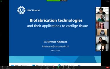 On 28th January, Ms Florencia Abinzano, PhD candidate at the Department of Orthopeadics, University Medical Centre (UMC) Utrecht, Netherlands, presented the invited talk “Biofabrication technologies and their applications to cartilage tissue” in the Seminar Series “Advances in Biomaterials 2021” at the Institute of Biomaterials. Florencia is carrying out her research project at the Malda Lab (Laboratory head: Professor Jos Malda) at UMC Utrecht working on developing advanced 3D biofabricated osteochondral implants, under the supervision of Dr. Riccardo Levato.