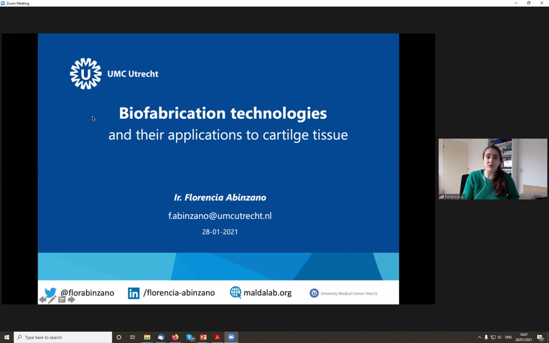 On 28th January, Ms Florencia Abinzano, PhD candidate at the Department of Orthopeadics, University Medical Centre (UMC) Utrecht, Netherlands, presented the invited talk “Biofabrication technologies and their applications to cartilage tissue” in the Seminar Series “Advances in Biomaterials 2021” at the Institute of Biomaterials. Florencia is carrying out her research project at the Malda Lab (Laboratory head: Professor Jos Malda) at UMC Utrecht working on developing advanced 3D biofabricated osteochondral implants, under the supervision of Dr. Riccardo Levato.