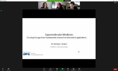 On 15th April 2021, Prof. Veronica I. Dodero, Organic and Bioorganic Chemistry work group (Head: Prof. Sewald), Faculty of Chemistry, Bielefeld University, presented the invited talk: “Supramolecular Medicine: Crossing the gap from fundamental research to biomedical applications” at the Institute of Biomaterials. We are exploring research collaborations with the group of Dr. Dodero in topics at the interface between supramolecular chemistry and biomaterials.