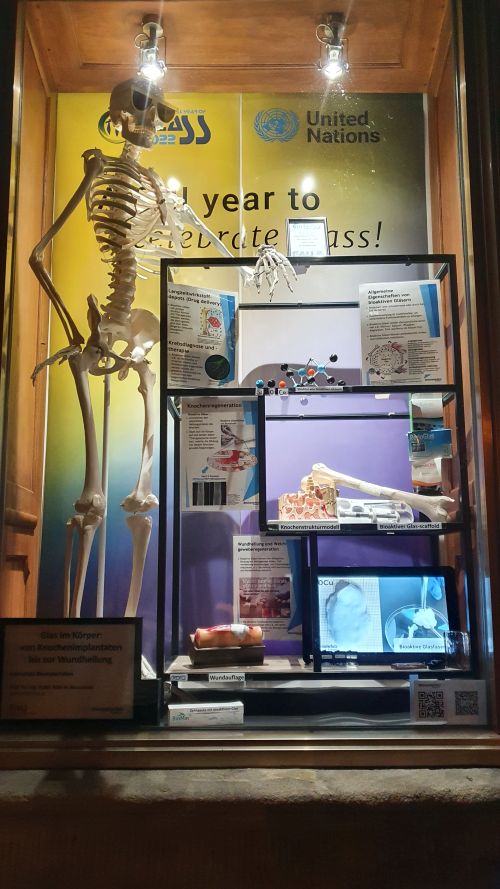 As part of the activities to celebrate the United Nations International Year of Glass 2022 (IYoG 2022) in Erlangen, our Institute is in charge of the display window in the Erlangen city centre at the Optikmeisterei on Neustädter Kirchenplatz in June. The window is dedicated to different topics around glass science and applications to inform the public with specific posters and exhibits during the year. For the month June, we prepared the showcase on “Bioactive glasses: from bone regeneration to wound healing and cancer treatment” with great support of Marcela Arango-Ospina and Dr. Judith A. Roether. A dedicated webpage informing the Erlangen activities around the 2022 Int. Year of Glass has been set: https://www.glass-ceramics.tf.fau.de/international-year-of-glass-2022-english-version/