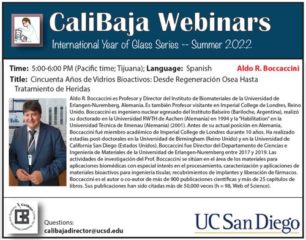 On 19th July, Prof. Aldo R. Boccaccini presented the invited talk: “Cincuenta Años de Vidrios Bioactivos: Desde Regeneración Osea Hasta Tratamiento de Heridas” (“50 years of bioactive glasses: from bone regeneration to wound healing”) in the framework of the CaliBaja Webinars, International Year of Glass Series — Summer 2022, organised by Prof. Olivia Graeve, University of California, San Diego (UCSD). The Webinar series marks the United Nations International Year of Glass 2022. The Webinars are dedicated to students, senior researchers and the general public, as part of a collaboration between CaliBaja Center for Resilient Materials & Systems, UCSD, USA, and the “Tecnológico Nacional de México Campus Tijuana”, Mexico, and other partners. Prof. Boccaccini delivered his presentation in Spanish language.