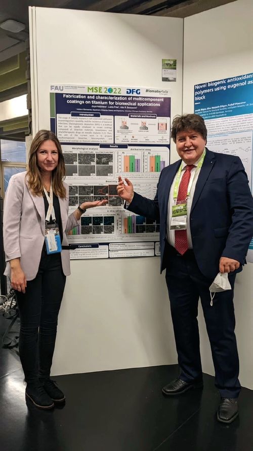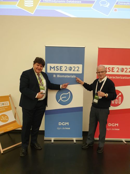 Our Institute had an active contribution to the success of the Materials Science and Engineering MSE Congress (MSE 2022) held in Darmstadt, Germany, and in hybrid format on 27 – 29 September 2022, a DGM (German Materials Society) conference. Prof. Boccaccini was a coordinator of the Topic “Biomaterials” with Prof. Corneila Lee-Thedieck, University Hannover. He also organised the symposium “Biomaterials Applications” with Prof. Sahar Salehi (Bayreuth) and Prof. Xanthippi Chatzistavrou (Greece), and he was the chair of several sessions during the conference. He also chaired the plenary session in which Prof. Daniel Cohn (Israel) presented the biomaterials related plenary talk. Ms Sonja Kuth, PhD student, presented the oral contribution: “Optimization of material parameters of an oxidized hyaluronic acid based bioink for soft tissue engineering”. Moreover, Ms Zoya Hadzhieva, PhD student, won the Best Poster Award (topic Biomaterials) for her poster, co-authored with Prof. Aldo R. Boccaccini titled: “Fabrication and characterization of multicomponent coatings on titanium for biomedical applications”.