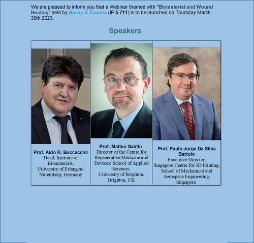 The Webinar “Biomaterials and Wound Healing” took place on 30th March 2023, hosted by the journal “Burns & Trauma”. Prof. Boccaccini presented the talk: “Bioactive glasses as multifunctional materials for wound healing and soft tissue repair”. The Webinar chairs were Prof. Gino Ambrosio (National Research Council, Naples, Italy) and Prof. Jun Wu (Director of the Department of Burns and Plastic Surgery, The First Affiliated Hospital of Shenzhen University, Shenzhen, Guangzhou, China), Editor-in-Chief of Burns & Trauma.