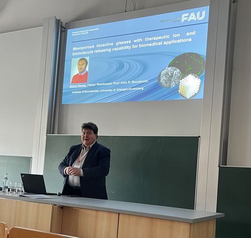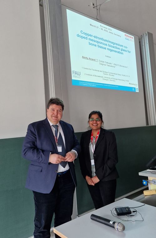 Our Institute was represented at the 98th Annual Meeting of the German Ceramic Society (DKG) Keramik/Ceramics 2023 by Ms Marcela Arango-Ospina (PhD student), Ms Usanee Pantulap (PhD student), Ms Akrity Anand (PhD student, based at FunGlass Centre, Slovakia) and Prof. Aldo R. Boccaccini. Also Dr. Rajan Choudhary (post-doctoral researcher at BBCE, Latvia, and currently visiting researcher in our Institute) attended the meeting. The conference took place in Jena on 27-30 March 2023. Prof. Boccaccini was a member of the organizing committee of Keramik/Ceramics 2023 and led the organization of the “Bioceramics” sessions, which he co-chaired during the event. He presented the talk: “Mesoporous bioactive glasses with therapeutic ion and biomolecule releasing capability for biomedical applications”, stepping in for Dr. Qaisar Nawaz, who could not attend due to illness. Ms Marcela Arango-Ospina presented the poster “In vitro evaluation of the angiogenic potential of dissolution products from bioactive glasses”, for which she received one of the “Best Poster” awards. Well done!