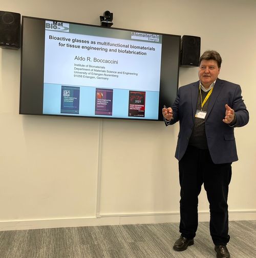 On 4th April 2022, Prof. Aldo R. Boccaccini visited the Henry Royce Institute at The University of Manchester, United Kingdom. He was hosted by Dr. Jonny Blaker, Research Area Lead for Biomedical Materials at Henry Royce Institute, and Senior Lecturer in Biomaterials at The University of Manchester. Prof. Boccaccini presented the lecture: “Bioactive glasses as multifunctional biomaterials for tissue engineering and biofabrication” providing a summary of the research activities being carried out at the FAU Institute of Biomaterials. After touring the top class facilities at Royce Institute, Prof. Boccaccini and Dr. Blaker further discussed areas for collaborative work between their groups, specially in the field of bioactive fibrous materials. We have collaborated previously extensively with Dr. Blaker (e.g. ref. [1]) as he was the first PhD student of Prof. Boccaccini back at Imperial College London in the early 2000s. Prof. Boccaccini pictured with Dr. Jonny Blaker and Prof. Brian Derby from Royce Institute.