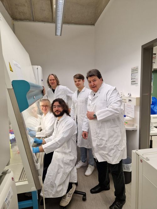 In the framework of the DFG funded Collaborative Research Centre CRC /SBF 1540 “Exploring Brain Mechanics (EBM) we have established a very effective collaboration with Dr. Renato Frischknecht, Department Biology, Chair of Animal Physiology (Prof. Dr. Brandstätter). Our collaboration with Dr. Frischknecht’s team involves the investigation of the behavior of primary neurons encapsulated in hyaluronic acid based hydrogels being developed in project X03. In the pictures: Sonja Kuth, Markus Lorke (PhD students, Biomaterials), Bartomeu Perelló Amorós (PhD student, Biology), Dr. Frischknecht and Prof. Boccaccini when visiting Dr. Frischknecht’s lab.