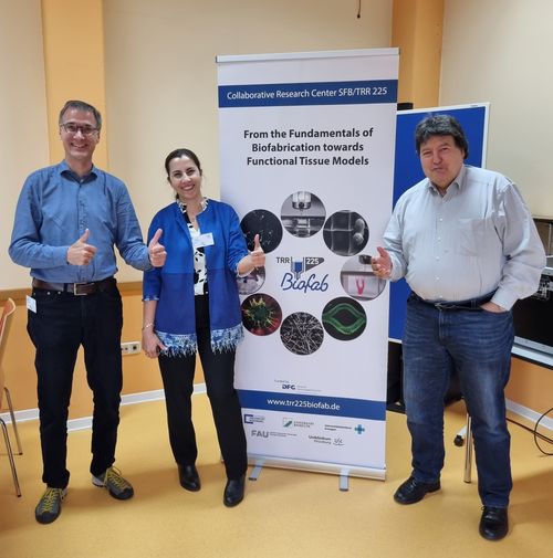 The first Autumn Retreat 2023 of the Collaborative Research Centre TRR/SFB 225 “From the fundamentals of biofabrication towards functional tissue models”, was held on 4-6 October 2023 in Lichtenfels. Hsuan-Heng Lu, Jonas Roeder (PhD students), Dr. Rainer Detsch and Prof. Aldo R. Boccaccini (pictured) attended the retreat. TRR 225 CRC is funded by the German Research Foundation (DFG), and is currently in the second funding period. The Centre brings together researchers from the three Northern Bavarian universities (University of Würzburg, University of Bayreuth and University of Erlangen-Nuremberg) to investigate the fundamentals of biofabrication and its applications to generate functional human tissue models. Jonas Roeder and Hsuan-Heng Lu gave presentations showing the results of their projects. Prof. Boccaccini is the spokesperson in TRR 225 for Erlangen (University of Erlangen-Nuremberg (FAU) and University Hospital Erlangen (UKER). Prof. Boccaccini is also a member of the TRR225 scientific board.