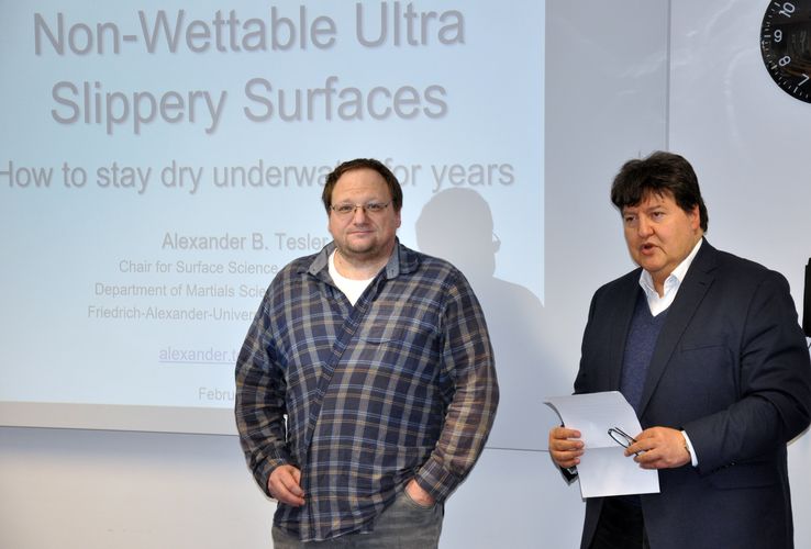 In the framework of the seminar series “Advances in Biomaterials”, Dr. Alexander B. Tesler, Institute for Surface Science and Corrosion, FAU, presented the invited talk: “Non-Wettable Ultra Slippery Metallic Surfaces for Biofouling- and Corrosion-Resistance Applications” on 15th February 2024. We discussed with Dr. Tesler possible collaboration in the field of surface functionalization of biomaterials with enhance antibacterial effects.
