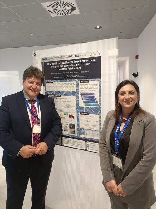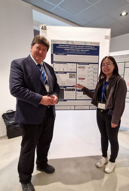 9/9ed to bioactive glasses, co-chaired by Prof. Boccaccini and Prof. Francesco Baino (Polytechnic of Turin, Italy), prof. Boccaccini presented the keynote lecture: “ADVANCED APPLICATIONS OF BIOACTIVE GLASSES: IONIC MEDICINE AND BIOFABRICATION, while Francesco Iorio presented a lecture in the P4FiT session on tendon tissue engineering. Hsuan-Heng Lu presented a poster showing her results in project B03 of the Collaborative Research Center (CRC) TRR 225 and Dr. Liverani presented a poster on Artificial Intelligence in electrospinning.