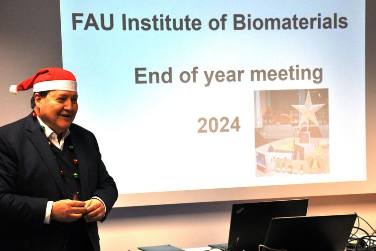 The End-of-Year Meeting and Christmas Dinner of the Institute of Biomaterials were held on 10th December 2024. Permanent staff, PhD students, post-docs, undergraduate students, academic visitors and guests attended the event. Prof. Boccaccini gave a presentation summarizing the main achievements and activities of the Institute in 2024. Two international events were mentioned as highlights of the year, namley i) the 8th China-Europe Symposium on Biomaterials in Regenerative Medicine, held in Nuremberg (Sept. 15-18, 2024), chaired by Prof. Boccaccini, and ii) the Symposium to celebrate the 15th Anniversary of the Institute, held in Erlangen on 29th November 2024. Prof. Boccaccini also highlighted several successful activities and outcomes of high impact in terms of acquisition of funding, publication of high impact papers (>92 in 2024) and important participation in major international conferences with contributed, invited and keynote talks. A special part of the presentation was dedicated to present the different awards and recognitions obtained by members of the Institute in 2024. Several activities organised in collaboration with our EU partners at FunGlass (Trencin, Slovakia), BBCE (Riga, Latvia) and NANOBLOC EU project were also showcased. In terms of teaching and supervision of undergraduate students, during 2024, more than 50 Master, Bachelor and Project students, including international (ERASMUS) students, carried out their theses/research projects in our Institute. In addition, 7 doctoral theses were completed, and we received in 2024 more than 40 academic visitors and international students from many countries around the world, confirming the high international visibility of our Institute. Merry Christmas and Happy New Year!