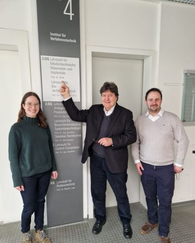On 15th January, Prof. Aldo R. Boccaccini delivered an invited lecture at Technical University of Munich, TUM School of Engineering and Design, to Bomedical Engineering Master students and researchers of the Chair of Medical Materials and Implants (MMI), (Head: Prof. Dr. Petra Mela). Prof. Boccaccini presented the lecture “Bioactive glasses: From bone tissue engineering to biofabrication and ionic medicine”. In the picture Christian Radwansky and Christina Ahrens (PhD students at MMI) and Prof. Boccaccini.