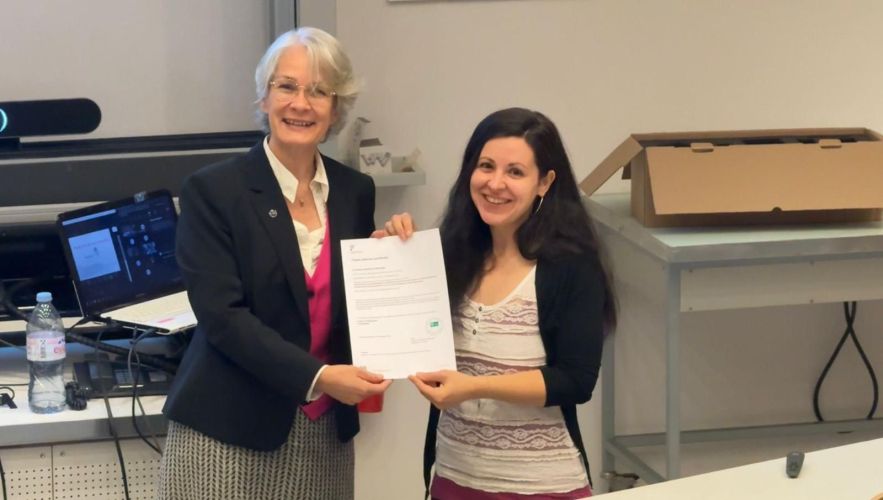 Congratulations to Paula Corcosa on successfully defending her doctoral thesis on 6th October 2025. She developed and characterized antimicrobial metal ion complexes which were embedded in electrospun biodegradable polymer fibers. Paula carried out her doctoral project at the University of Fribourg, Switzerland, Department of Chemistry, supervised by Prof. Katharina M. Fromm. She conducted part of her experimental work under supervision Prof. Aldo R. Boccaccini at the FAU Institute of Biomaterials. Prof. Boccaccini highlighted the innovative character of Paula’s project, in which the clear added value of combining chemistry with materials science and engineering was demonstrated through the development of a new family of antibacterial fibrous structures with potential applications in wound healing and soft tissue engineering. Many congratulations again to Paula on the successful defense of her doctoral thesis. We wish her all the best in her future career!