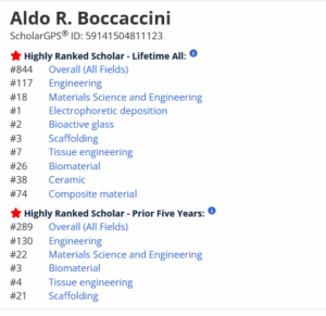 Prof. Aldo R. Boccaccini has been listed as one of the Highly Ranked Scholars™ in the ScholarGPS® platform. According to the webpage of ScholarGPS®, “Highly Ranked Scholars are the most productive authors (by number of publications) whose works demonstrate exceptional impact (citations) and outstanding quality (h-index). These scholars hold a ScholarGPS® Rank within the top 0.05% in any given Field, Discipline, or Specialty. It also mentions that the identification of ScholarGPS® Highly Ranked Scholars™ is based on lifetime or prior five-year activity, with each publication and citation weighted by the number of authors and self-citations excluded. All scholars—including inactive, deceased, and retired—are included in the analysis”. Details about the Ranking Terminology and Methodology are available here. In the speciality “Biomaterial” (Lifetime All, 2025), 86 scholars are listed worldwide, with Prof. Boccaccini at position 26, being the only researcher listed for Germany. Prof. Boccaccini said: “There are indeed many rankings based on publication metrics. Although these rankings are of course not the only indicator of overall quality, a high position in the rankings does reflect the impact our research has had in the field over the years, at least from the perspective of scholarly publications”.