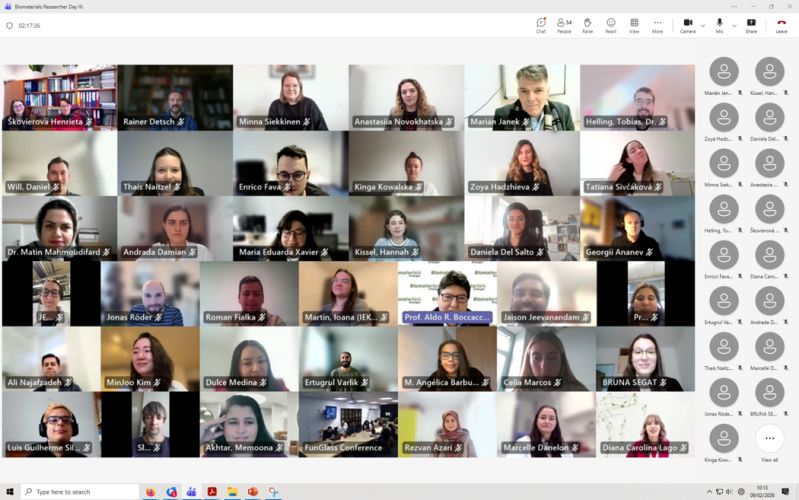 Co-organised by Dr. Martin Michálek (Head of Biomaterials Department, FunGlass Center, Trencin, Slovakia) and Prof. Aldo R. Boccaccini, the 3rd Biomaterials Research Day of the Department of Biomaterials at FunGlass Center was held on 9th February 2026 in hybrid form. This scientific symposium included 10 presentations from researchers from FunGlass Center and from the FAU Institute of Biomaterials. Several presentations were the result of the long standing collaboration between both Institutes. Prof. Boccaccini said: “It is great that we organised the Research Day for the third consecutive year. There were very interesting presentations, mainly from early career researchers, showcasing the broad biomaterials areas being investigated in both institutions. We had also invited speakers. Several presentations showed new research directions that we will follow to expand the collaboration and opportunities at both institutions”. The event attracted more than 70 online attendees, highlighting the strong international interest in biomaterials research. Congratulations to the members of our Institute who delivered outstanding presentations, PhD students: Hannah Kissel, Andrada-Ioana Damian-Buda, Jonas Röder and Memoona Akhtar.